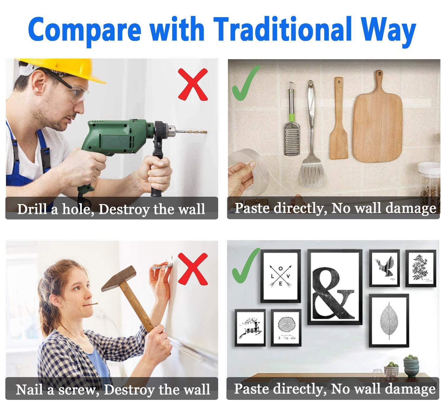 - MULTIPURPOSE USE - This Nano Silicone tape can be used to paste objects for multipurpose, such as photo frames, Balloons, Name plates, LED Strip lights, LED ropes, Power socket, Universal socket, curtain string, Paper hanging, light ropes, Foam boards, Party hall, Marriage hall, stage decorations, Keys, key holder, carpets, table cover, hang kitchen tools, kids bed room, Study room, baby stickers, wall papers, hooks, mobile phone holders, wall stickers, calendars, hold wires and cables.